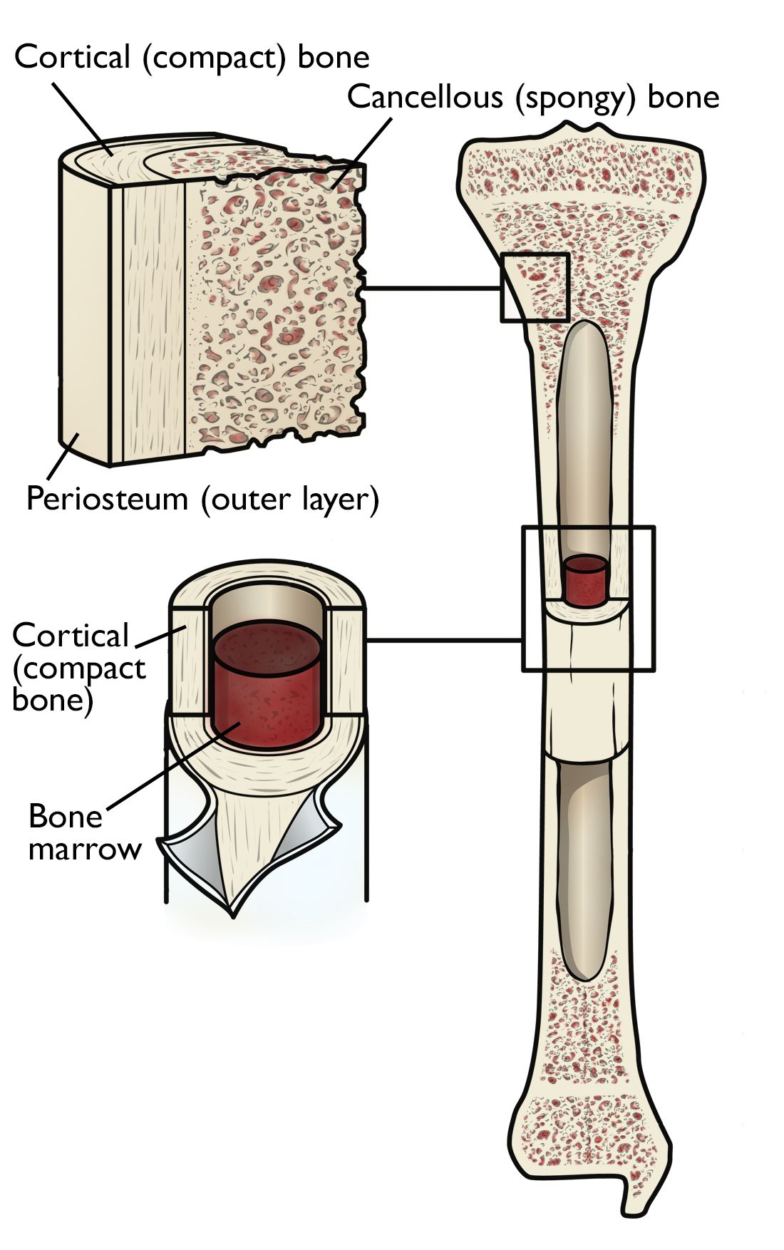 Long bones have a thick outside layer of compact bone and an inner medullary cavity containing bone marrow.